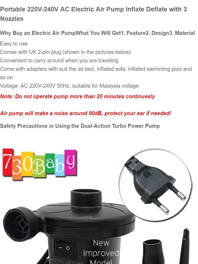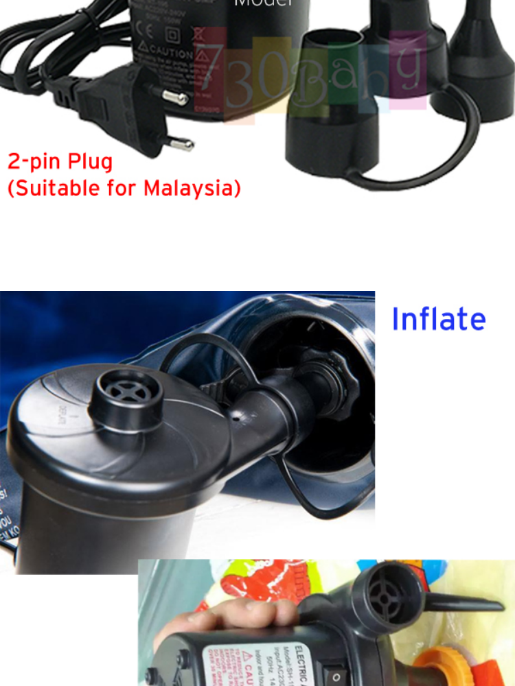730Baby Portable 220V-240V Electric Air Pump Inflate Deflate with 3 Nozzles For Inflatable Air Bed Mattress Sofa Swimming Play Pool Float Pam Angin Pelampung